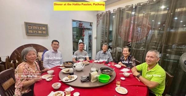 Meeting Hakka friends from USA and Malaysia at the Hakka Passion restaurant in Puchong Malaysia. Right to Left -Kris Waren from Gilroy, CA, Sadat Foster, former Malaysia Economic Trader Officer in Los Angeles, David and Mee Jin, and Alex Wong from Puchong. 9-20-19