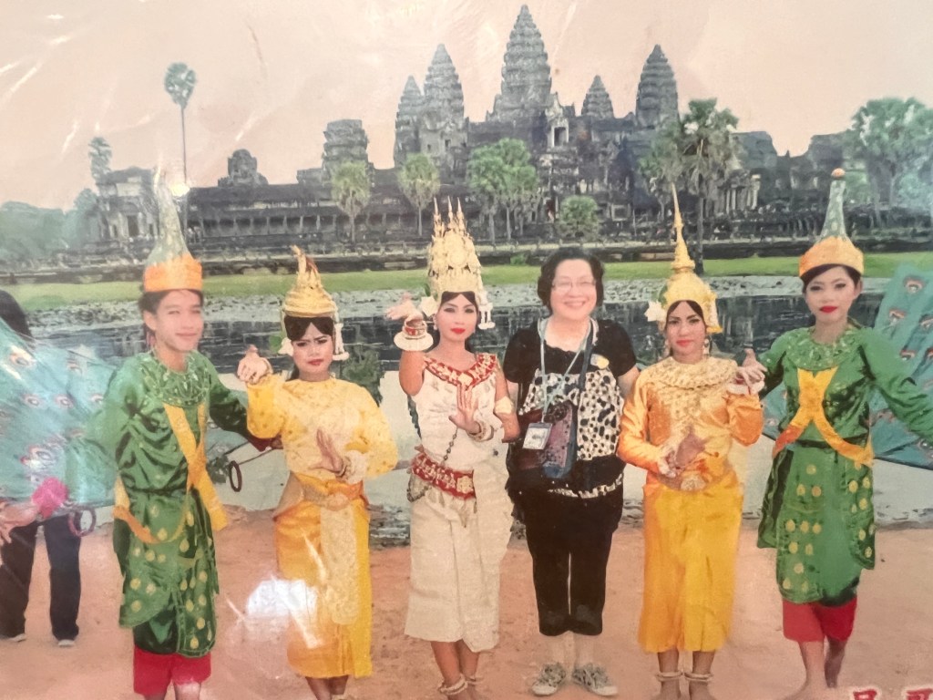 Mee Jin taking photos with the local people in their costumes in Ankore Wat.